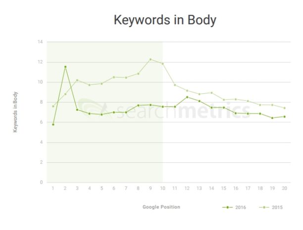 - Les mots clés de la requête de moins en moins présents dans le contenu (-20% vs. 2015), dans les les titres (title) et dans les H1 des pages du top 20.