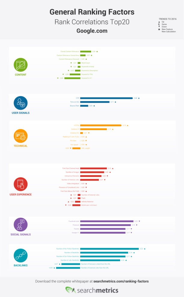 La corrélation entre les différents éléments d’un site web et le positionnement des pages sur Google sont résumés dans l’infographie ci-dessous. Pour aller plus loin, nous vous conseillons de télécharger l’étude Searchmetrics en cliquant ici.
